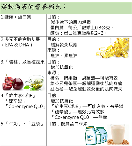 介紹飲食補充之前,還是要先說明營養在運動傷害中,所扮演的二大目的。第一、減少當下的肌肉耗損,第二是緩解後受傷的發炎反應。也意思是說,前者是運動後的立即性補充,讓身體有足夠原料,修補當下的傷害;後者,則是減少傷害後發炎及疲勞,無論是運動後馬上吃,或是平日飲食中增加攝取量,都不會有太大的差別。